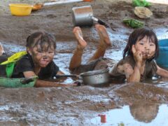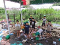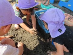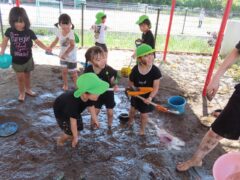 ☆3~5歳児どろあそび☆ 子どもたちが大好きな泥あそび! 山を作って、川を作って、水を運んで…と友だちと協力し、泥だらけになりながらあそんでいました!